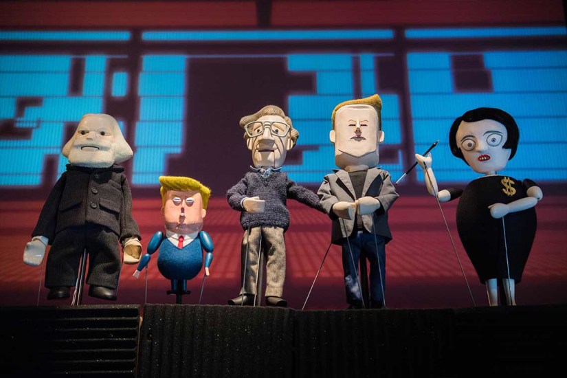 Noam Chomsky, Steve Jobs, Ayn Rand, Karl Marx, Elon Musk, and President Drumpf are among the figures represented in Pedro Reyes’s satirical puppet play, Manufacturing Mischief. Tackling ideas around the ethics of artificial intelligence, the use of technology to solve humanity’s problems, Randian philosophy, and the current political climate in the U.S., Reyes blends dark humor with sharp cutting commentary on morality, freedom, inequality, and techno-enthusiasm. Also: Karl Marx raps.